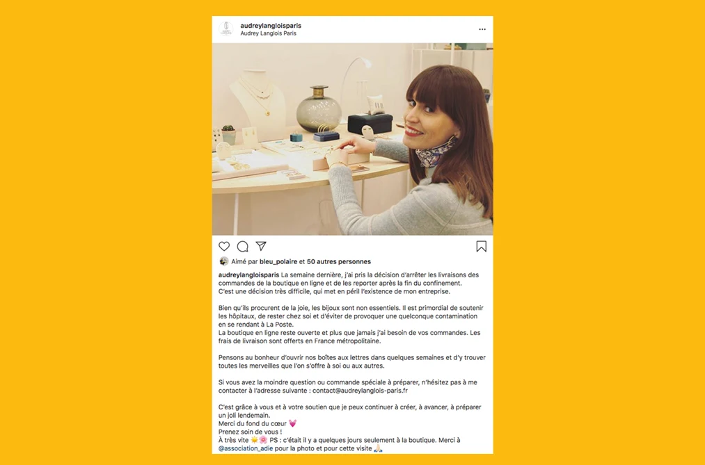 C’est ce que fait Audrey Langlois, bijoutière. Elle nous explique que les commandes en ligne seront bien prises en compte, mais que l’envoi se fera après le confinement, car « bien qu’ils procurent de la joie, les bijoux sont non essentiels. Il est prioritaire de soutenir les hôpitaux et d’éviter de provoquer une quelconque contamination en se rendant à La Poste. »