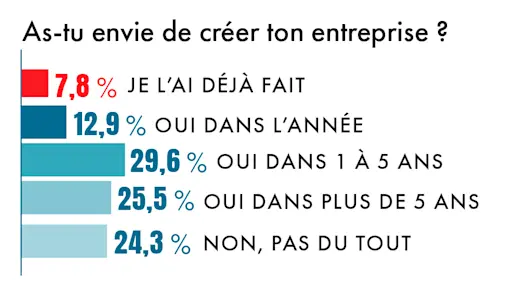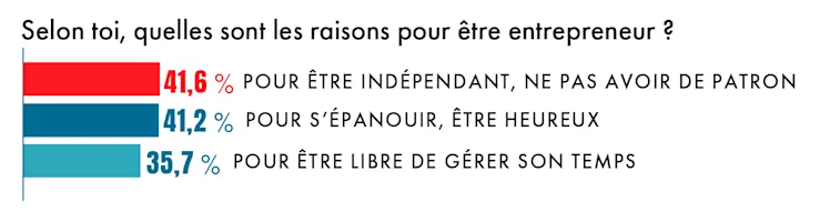 Les ¾ des jeunes sont concernés par la création d’entreprise, soit parce qu’ils en ont envie soit parce qu’ils l’ont déjà fait. Ce choix de vie professionnelle est motivé essentiellement par un besoin d’indépendance et la volonté de s’épanouir tout en gérant son temps de façon autonome.