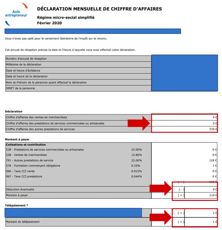 J’indique le chiffre d'affaires encaissé (même si celui-ci est nul) durant le mois ou trimestre civil dernier arrondi à l'euro le plus proche en fonction de mon activité.