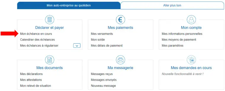 Une fois connecté à mon compte, je clique sur la sous-rubrique « Mon échéance en cours » située dans l’onglet « Mon auto-entreprise au quotidien » et dans la rubrique « Déclarer et payer ».