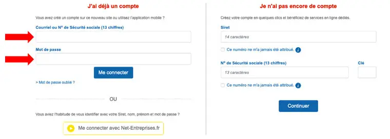 Si c’est ma première déclaration, je dois d’abord créer mon compte en renseignant mon numéro de SIRET et mon numéro de sécurité sociale dans la rubrique « Je n'ai pas encore de compte ».